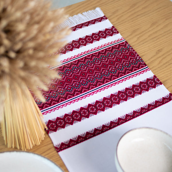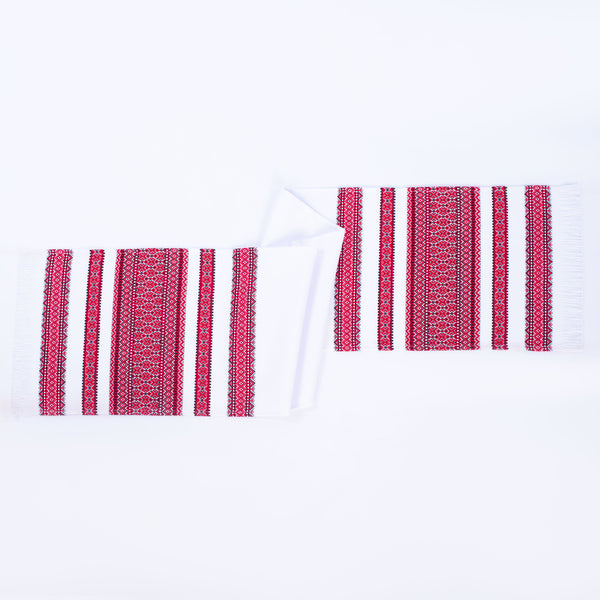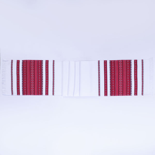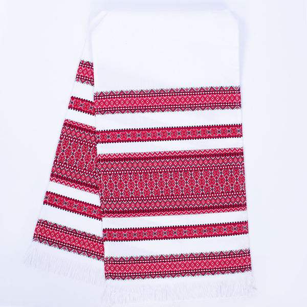 Nicely woven rushnyk is 59 in long x 13 in, wide with red and black traditional design. Background is natural textured linen color (not bright white) Makes a fine table runner for the holidays! Made in Ukraine.
