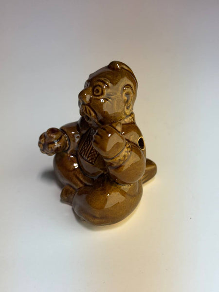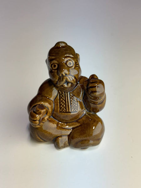 Ceramic figurine in traditional Ukrainian folk style, depicts a kozak dressed in characteristic folk attire with embroidery design. He holds a glass and a pipe. Expressive facial features and detailed sculpting give the piece a lively, individual vibe. Finished with a glossy glaze in warm brown tones, the figurine highlights the texture and displays the craftsmanship of the artist.