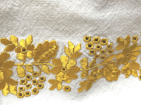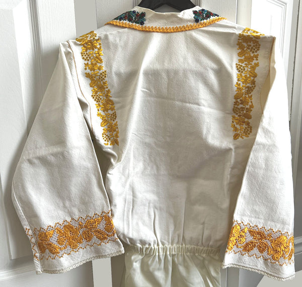 This vintage blouse is handmade on homespun cotton-linen blend fabric (of substantial weight). Embroidered in flat stitch with colorful beadwork, collar neckline. Long sleeves with embroidery and open cutout work, finished in crochet. Top is original homespun fabric, and has shirt cotton peplum with elastic added to bottom to tuck into skirt or wear over skirt/slacks with a wide belt. Has an awesome amount of embroidery and beadwork. Totally amazing vintage blouse! Mint condition.Â