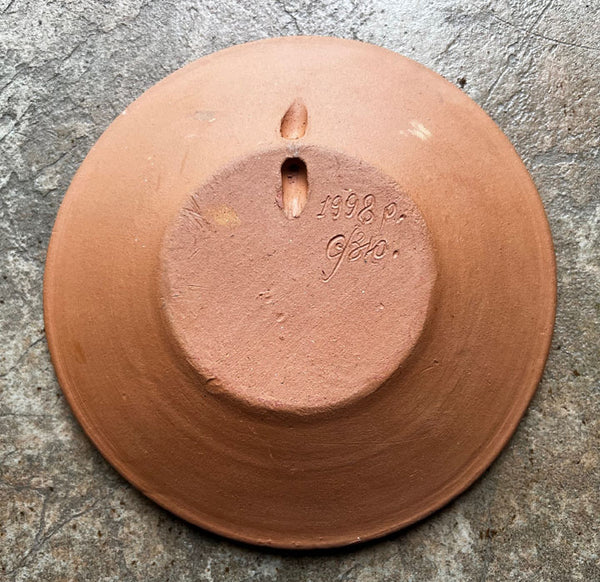 Dimensions 6.5" diam., 1.5" depth. Rear of plate has hole for hanging wire.
