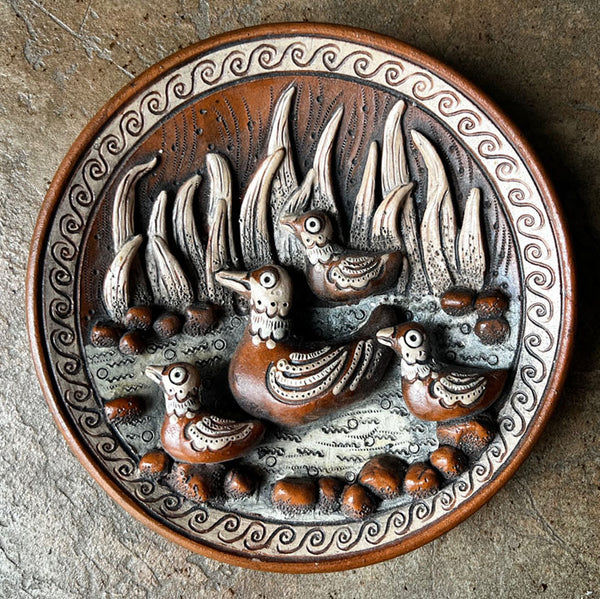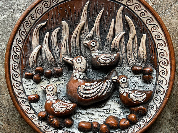 Fantastic ceramic plate depicts a family of ducks. The whimsical scene with richly textured details is amazing. The 3-D relief composition reflects Ukrainian folk elements and style. Finished in natural earthy beige and brown tones. Designed for wall display or plate stand, it serves as a meaningful decorative accent and a symbolic Ukrainian folk-art piece. Unique, one of a kind.