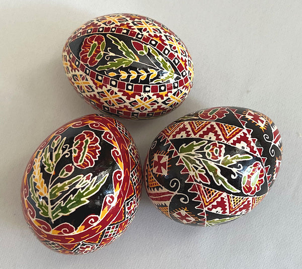 Beautifully made colorful pysanka has traditional floral poppy design. Each pysanka is different, the images are representative. Currently, all pysanky have red poppies. Chicken size. Made by Western Canadian artist Iris. Sold singly, designs will vary. (stand not included)