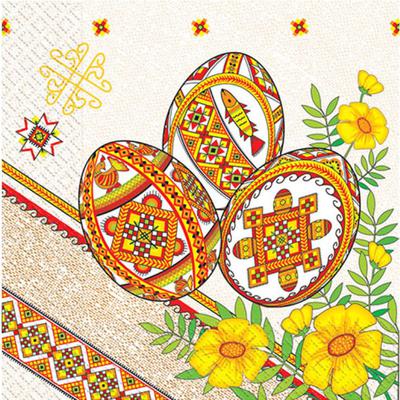 Colorful design of white Hutsul pysanky with flowers and embroidery.