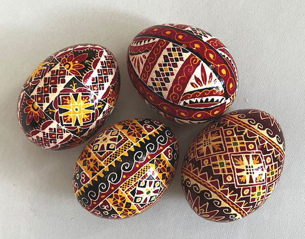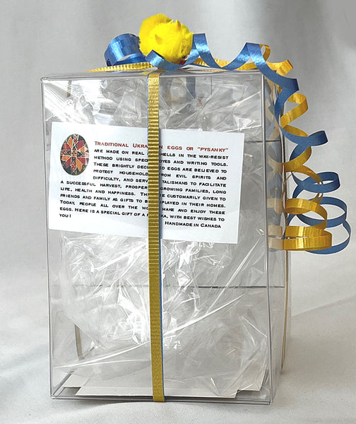 Gift box contains two boxed chicken-sized handmade pysanky with traditional designs. Fine detail and lovely bright patterns will surely impress the recipients! Designs vary - the pysanky will all be different (representative samples shown in images). Made on emptied shells. Clear package is tied with decorative ribbon, and a descriptive card is included in English. Made in Canada by Canadian-Ukrainian artist.