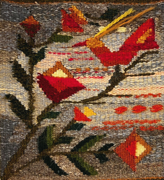Wall hanging in specific colorful weaving technique, with an image or ornamental design. Historically created for a lasting decoration for the home, often done in wool or silk.