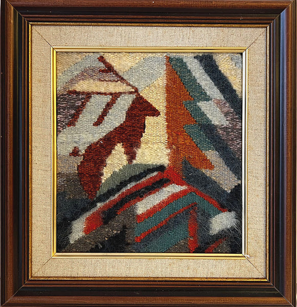 Wall hanging in specific colorful weaving technique, with an image or ornamental design. Historically created for a lasting decoration for the home, often done in wool or silk.