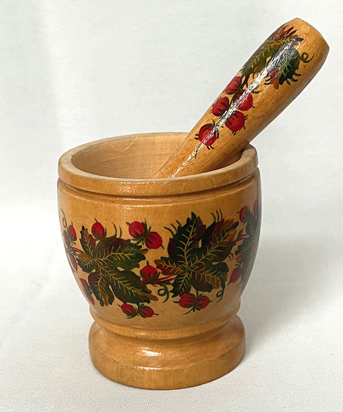 Beautifully painted hardwood mortar and pestle. 6" in high, 2.5" in width. Feel the quality and weight of the hardwood. Signed. Made in Ukraine.