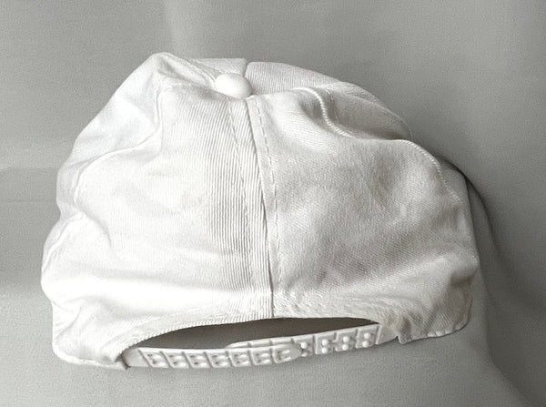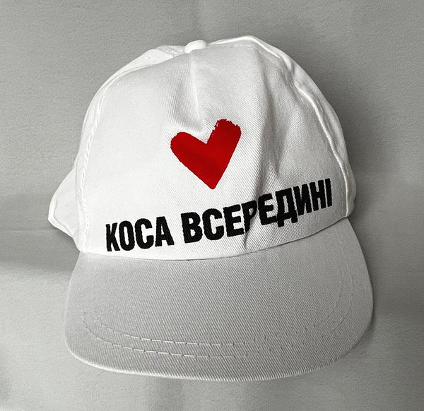 White cotton cap with adjustable closure, "Kosa v seredyni" printed design ("Braid inside"). vintage, clean (unworn), Adult size, adjustable. Made in Ukraine.