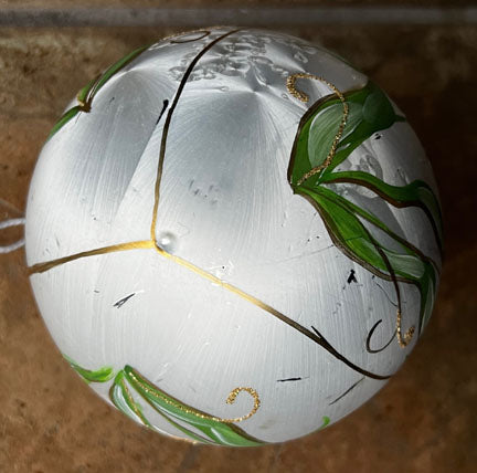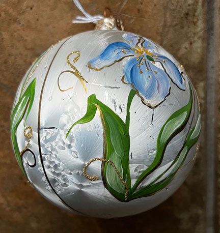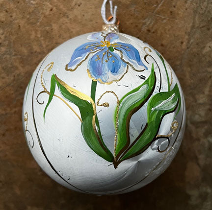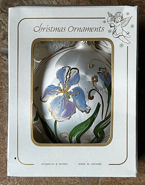 Large hand painted boxed ornament on white with a lovely iris flower, glitter accents. 4" diameter. Gift Boxed. Made in Ukraine.